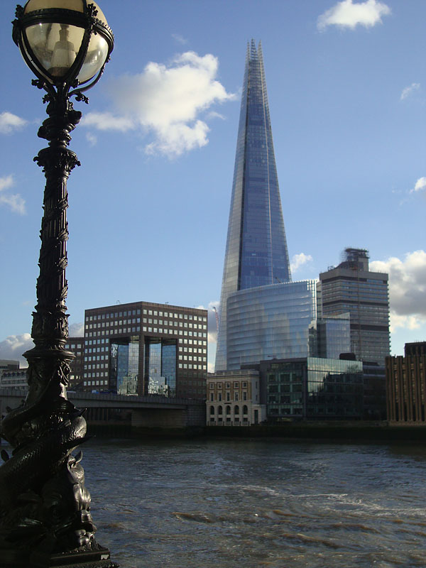 The Shard and Number One London Bridge can be seen on the other side of the Thames.